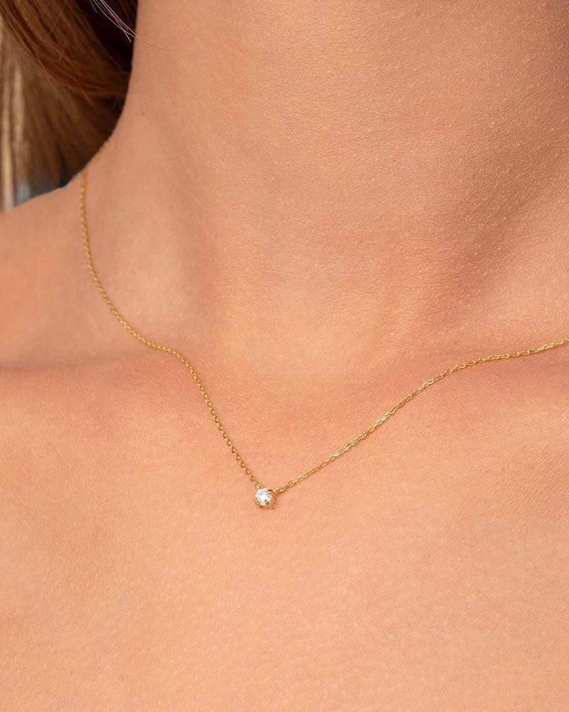 Réalisé à la main dans notre atelier en France, ce collier met en valeur un solitaire central d'une grande finesse, suspendu à une chaîne fine. Son design épuré et minimaliste épouse parfaitement les robes à encolure dégagée, bustier ou col en V, en apportant une touche subtile de lumière.