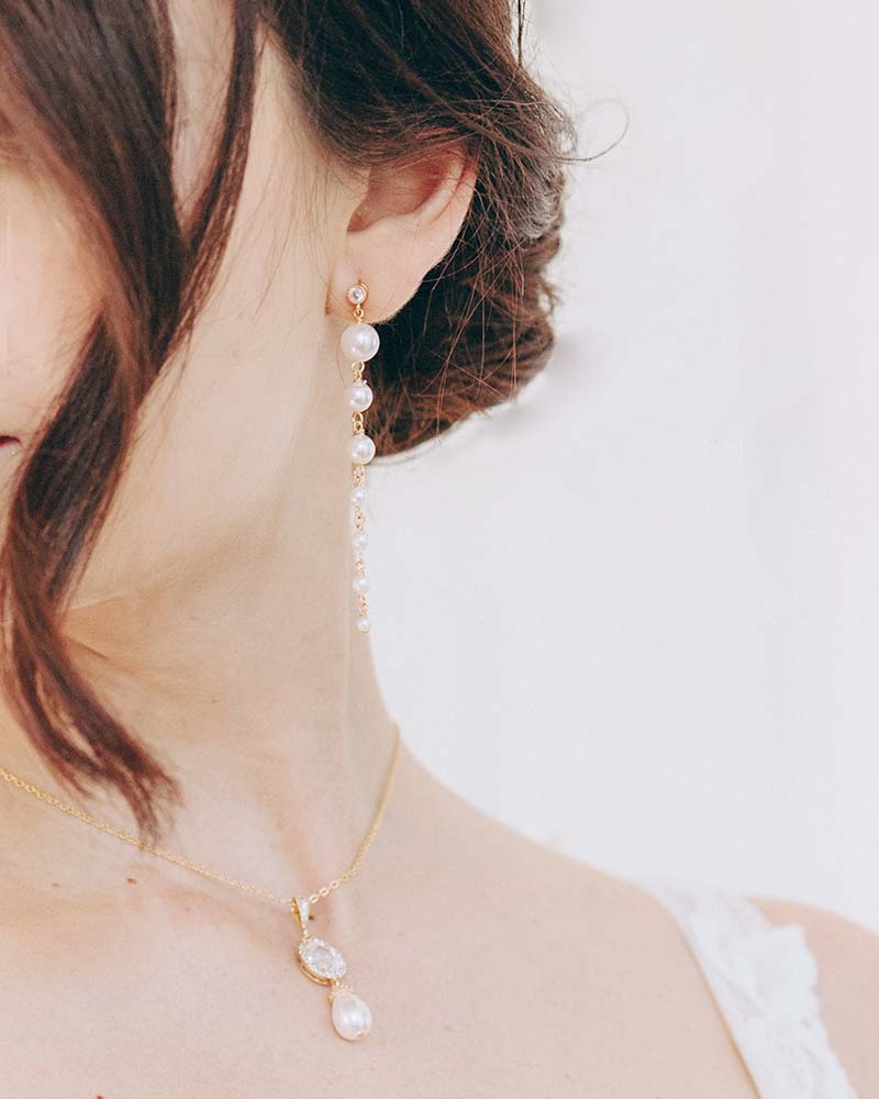 Confectionnées à la main dans notre atelier en France, elles marient des perles nacrées à une structure fine et fluide. Leur silhouette pendante encadre joliment le visage et s'harmonise parfaitement avec une coiffure relevée, floue ou semi-lâchée. Elles offrent un équilibre subtil entre modernité et tradition.