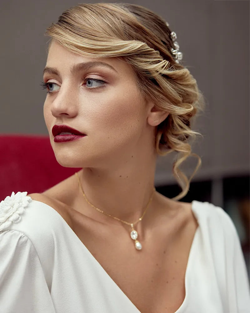 Le collier Jessica est une création lumineuse et féminine, conçue pour sublimer le décolleté de la mariée avec éclat et délicatesse.
