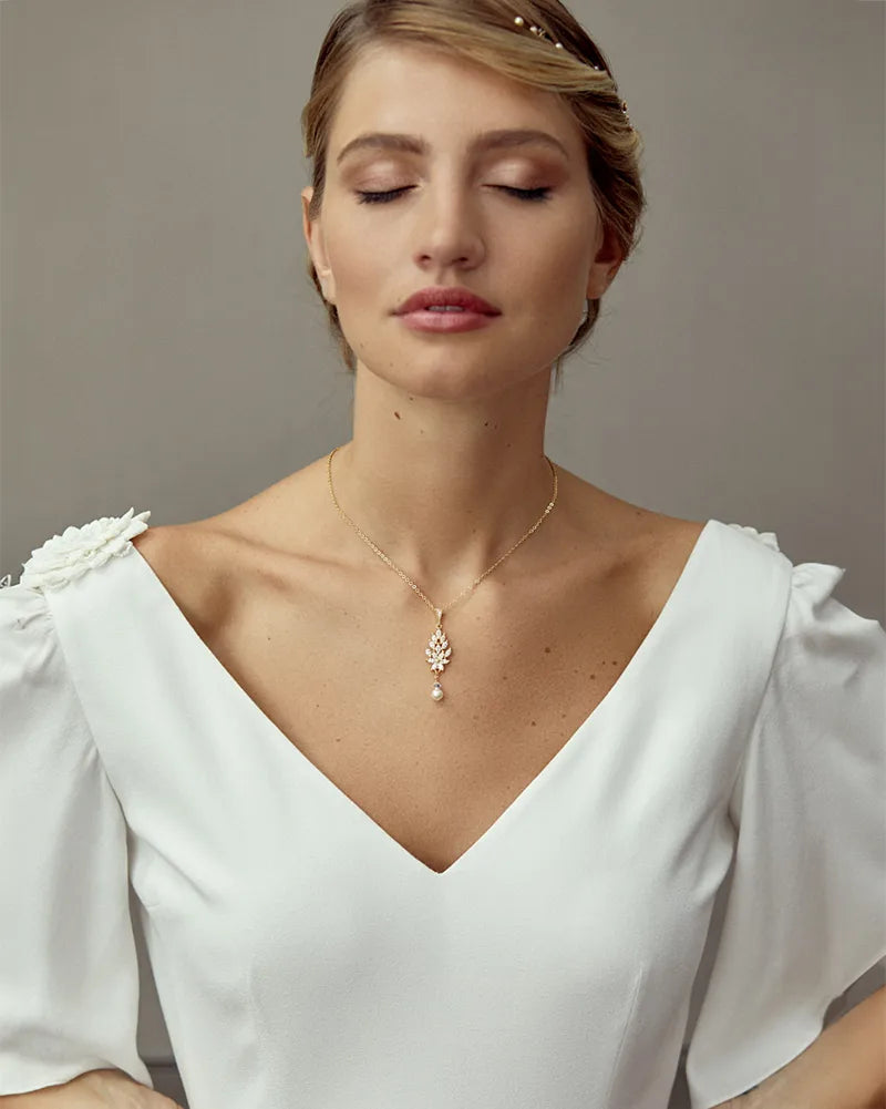 Le collier perle Souley est une pièce délicate et moderne, pensée pour illuminer le décolleté de la mariée avec finesse et personnalité.
